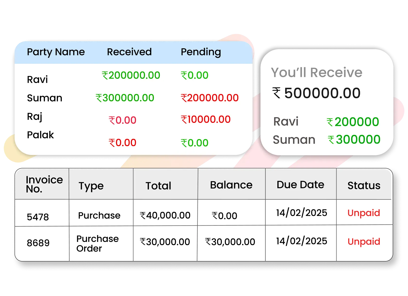 Complete transaction history for each supplier is available in one place. You can quickly check total purchases, payments made, and pending amounts. This improves clarity and simplifies reconciliation.