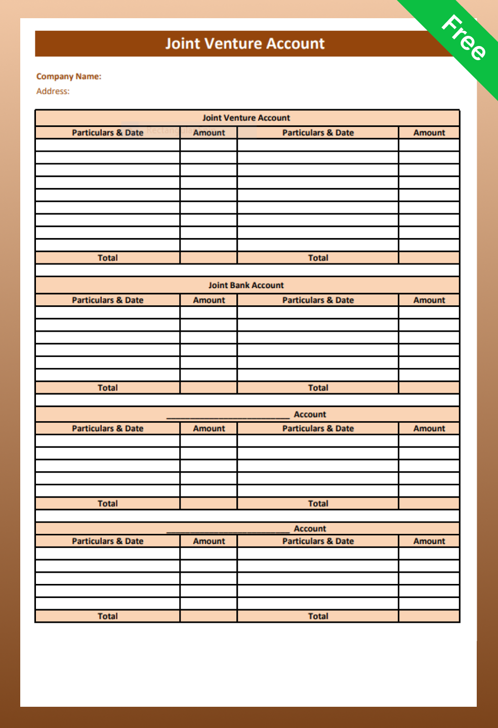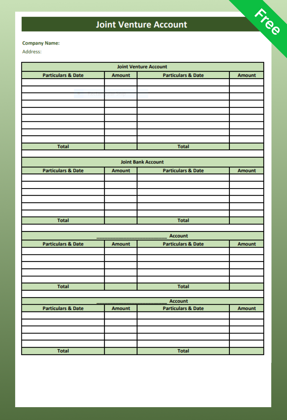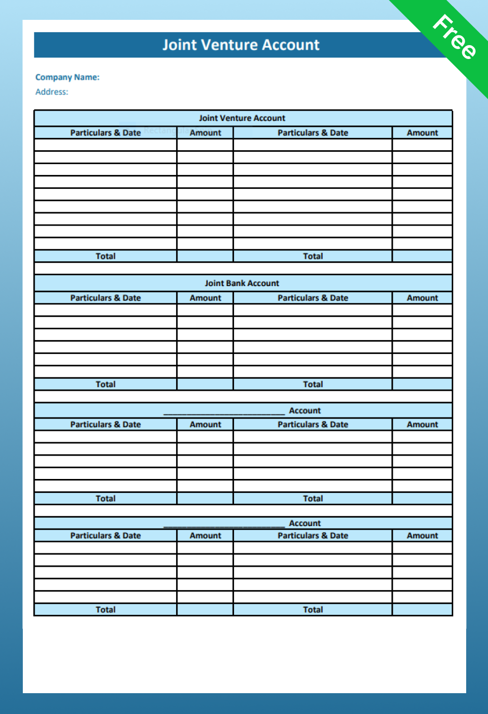 A Joint Venture Account Format helps partners record transactions, monitor performance, and distribute profits accurately. Below are the main types of accounts used in joint venture accounting:
