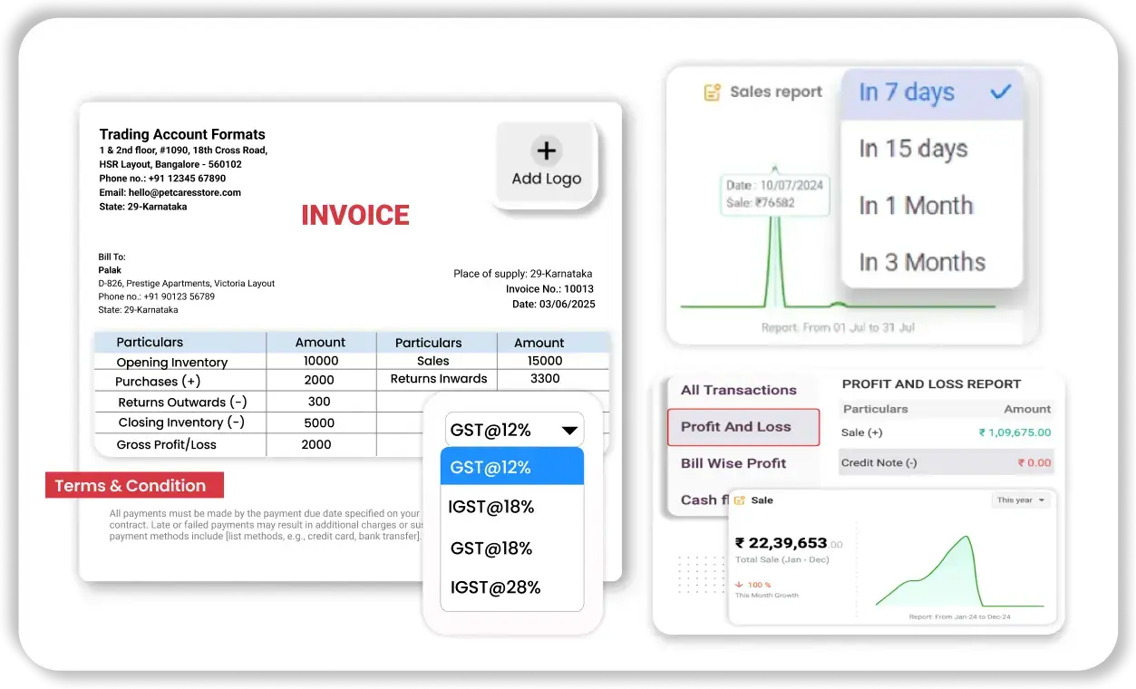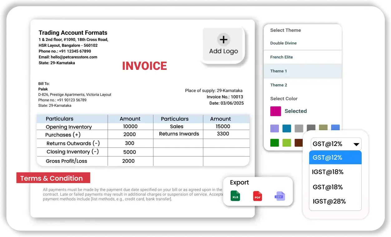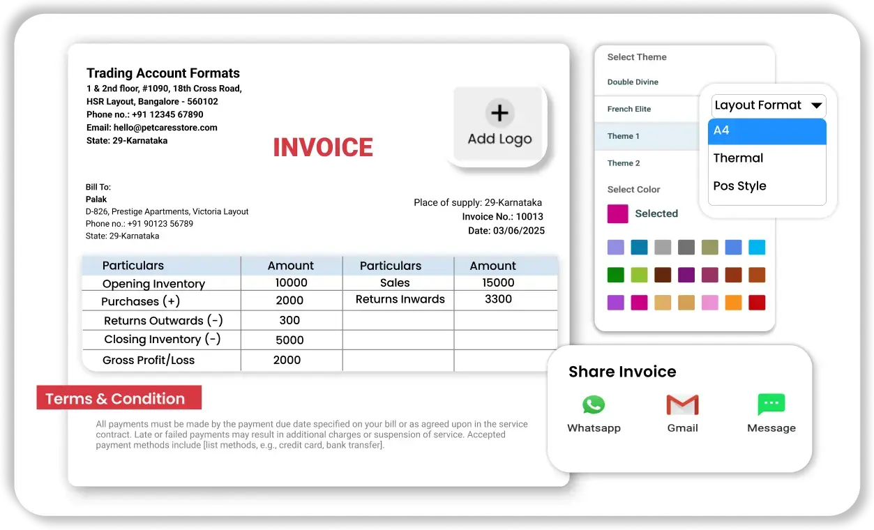 Along with trading account templates, Vyapar comes with powerful invoicing features. Create, send, and manage professional GST-compliant invoices in minutes. It simplifies billing and reduces the time you spend on paperwork.