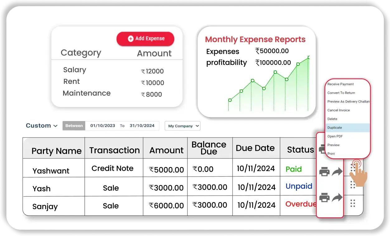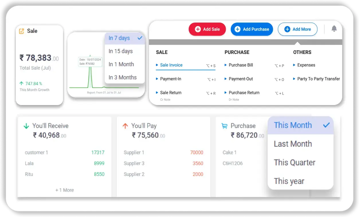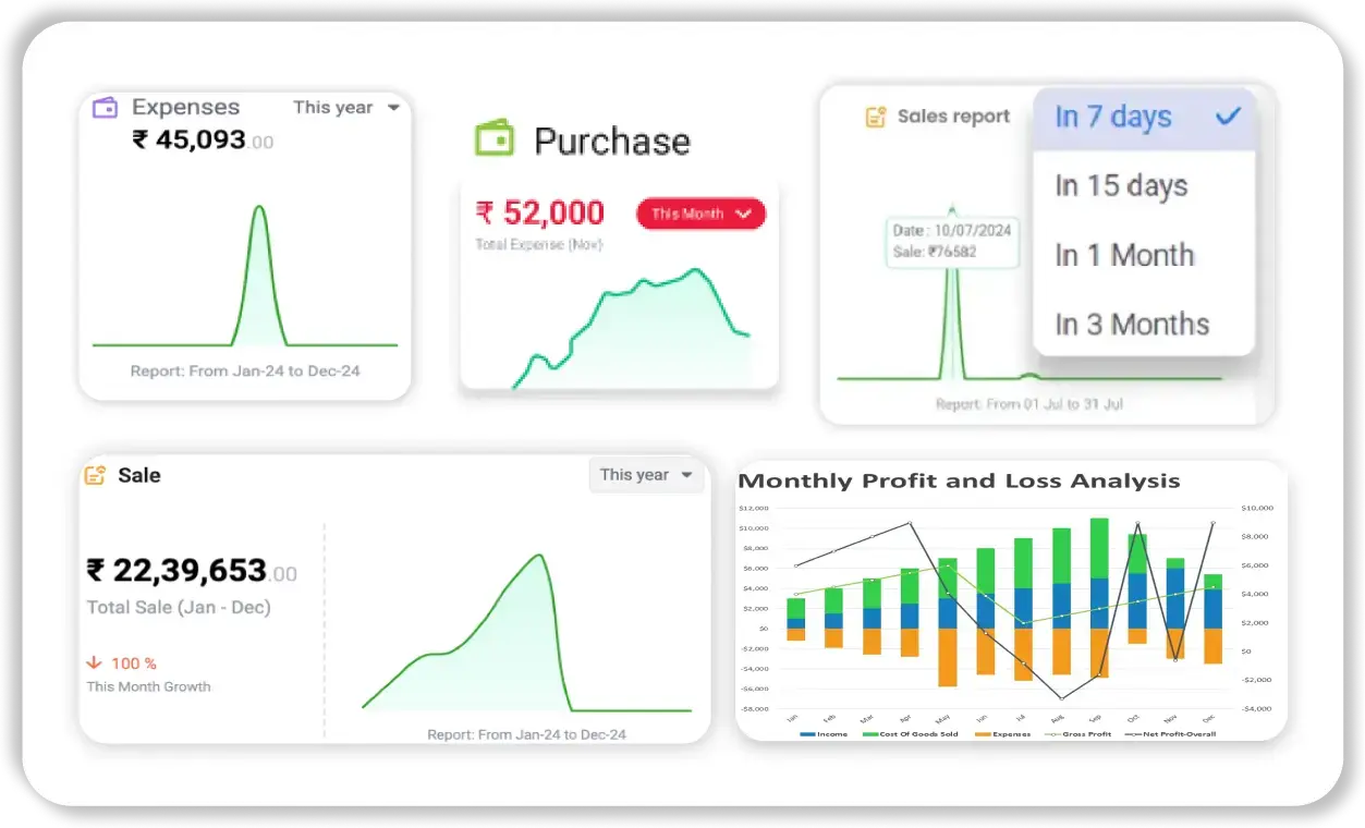No more juggling multiple tools. With Vyapar, you can monitor cash flow, sales, and expenses in real-time — all from one dashboard. This helps you stay on top of your business and make faster, smarter financial decisions.