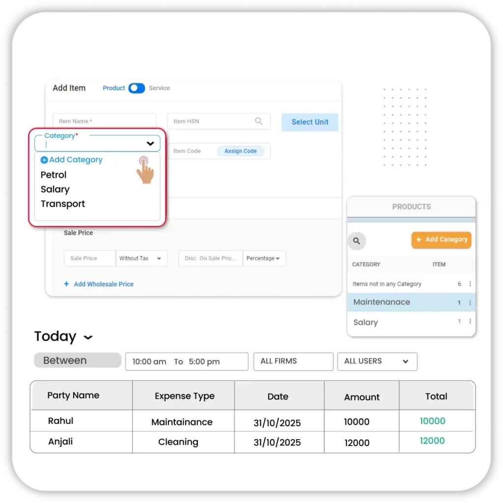 Keep your business expenses organised and up-to-date with Vyapar. The app lets you record every expense instantly — whether it’s rent, salaries, electricity, or travel — right from your mobile or desktop.