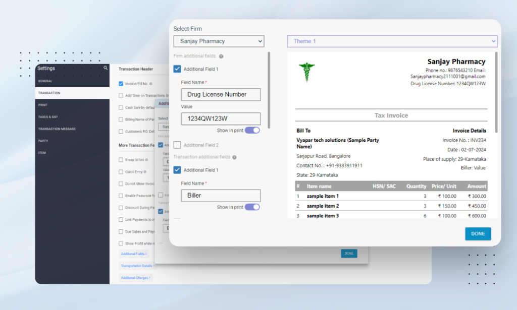 - Attach License to Invoices: Add your medical shop drug license number automatically to every invoice without manual entry.