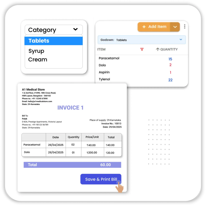 - Faster Search: Easily find and add medicines to bills using category filters. This saves precious time during busy hours and speeds up operations using efficient medical store billing software.