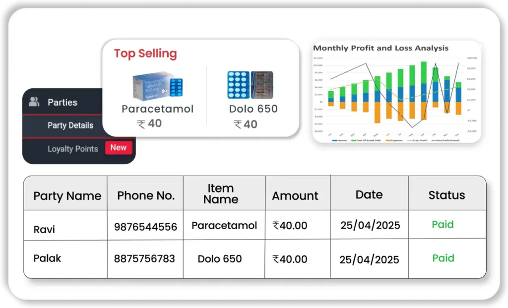 Get instant reports like profit and loss, inventory, and sales summaries with Vyapar’s medical store billing software free download to make smarter business decisions.