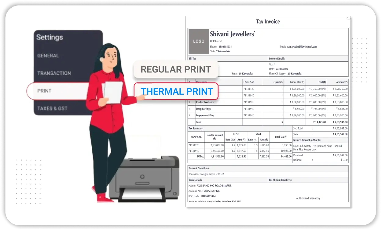 - Format Options: Choose between A4 or thermal print based on your cake shop billing system setup.
