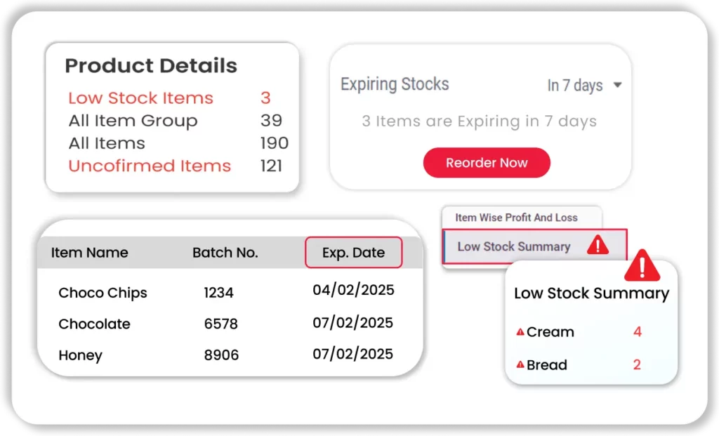 Vyapar’s bakery billing system updates your stock in real-time as you bill, helps prevent overstocking/spoilage, and alerts you when ingredients are low.