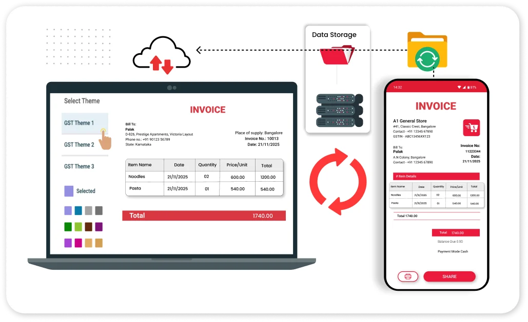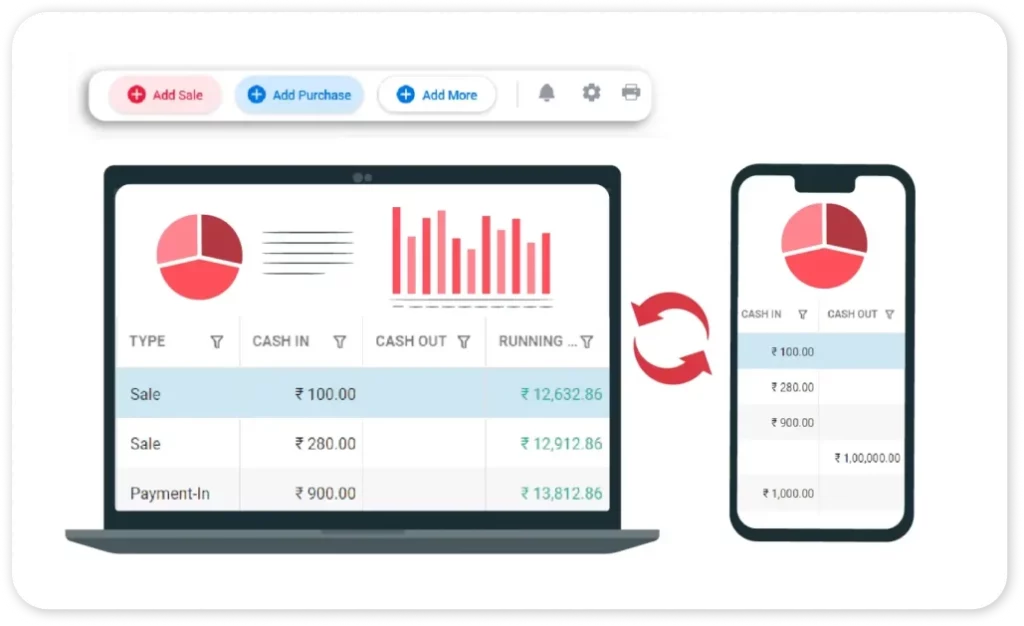 Whether you operate from your mobile or desktop, Vyapar keeps your entire store connected. Multiple staff can manage billing, stock, and reports at the same time with real-time sync.