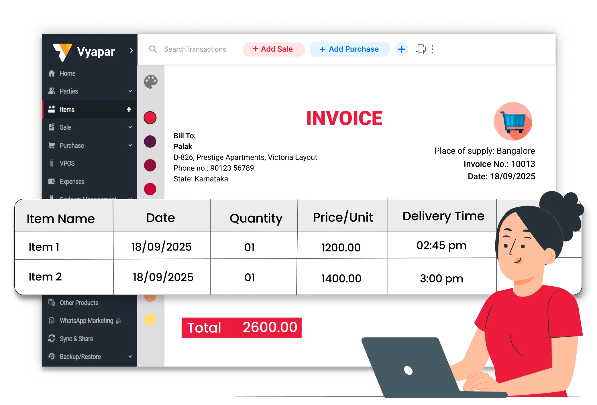 Vyapar billing software in a departmental store can manage sales in multiple sales desks together. You can use the Vyapar invoicing app on Android smartphones and Windows desktop computers. Using the sync feature in the app, you can have mobile devices use it seamlessly.