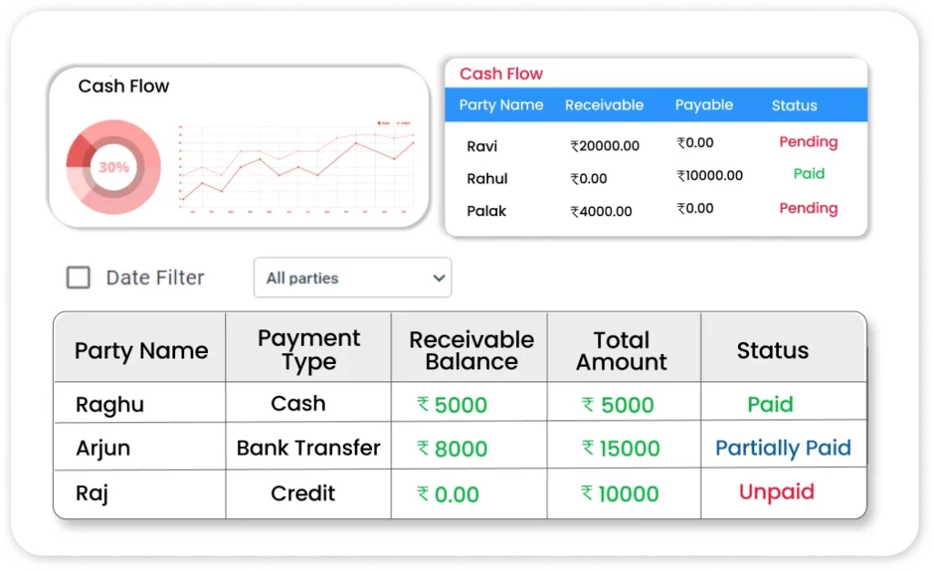 Easily track the cash flow of your business by analysing your account receivables and payables. Using the Vyapar billing app dashboard, you can know the financial health of your business anytime. Make sure that you have enough cash reserves to continue business operations effectively in the current month