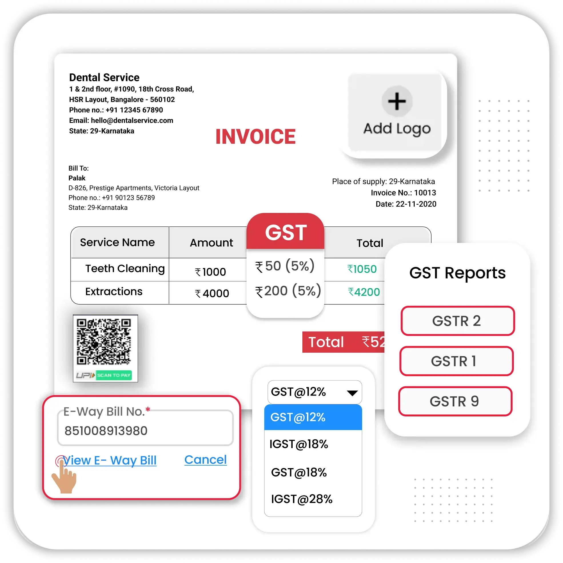 - Auto GST Handling: Automatically applies the correct GST rate based on the destination state (interstate or intrastate) and service type, reducing errors during tax filing.