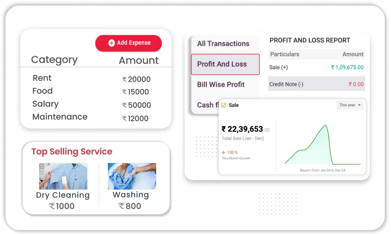 - Expense Tracking – Keep track of business expenses and profit margins with comprehensive reports generated by Vyapar’s dry clean software.