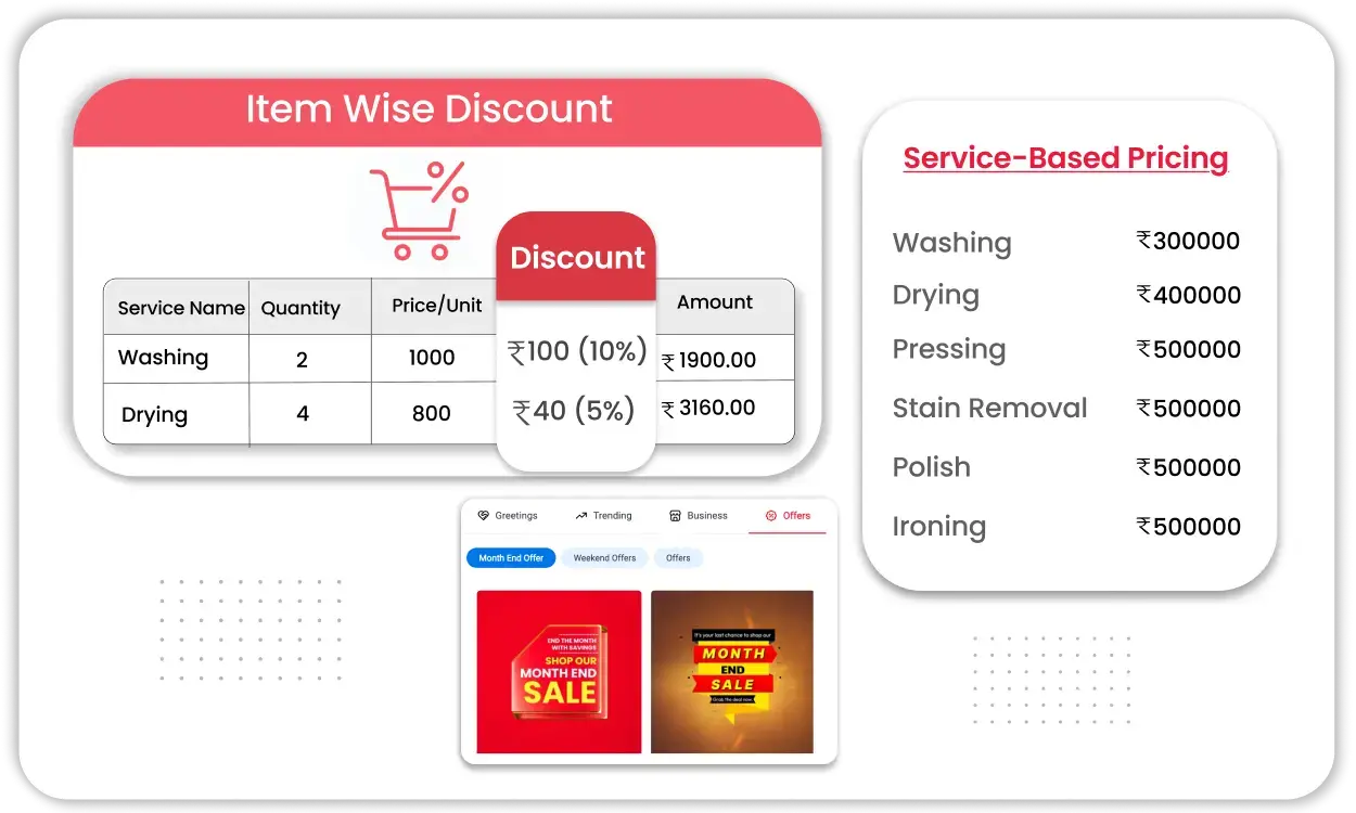 - Discounts & Promotions – Run seasonal promotions or offer discounts to your customers using Vyapar’s quick dry clean software.