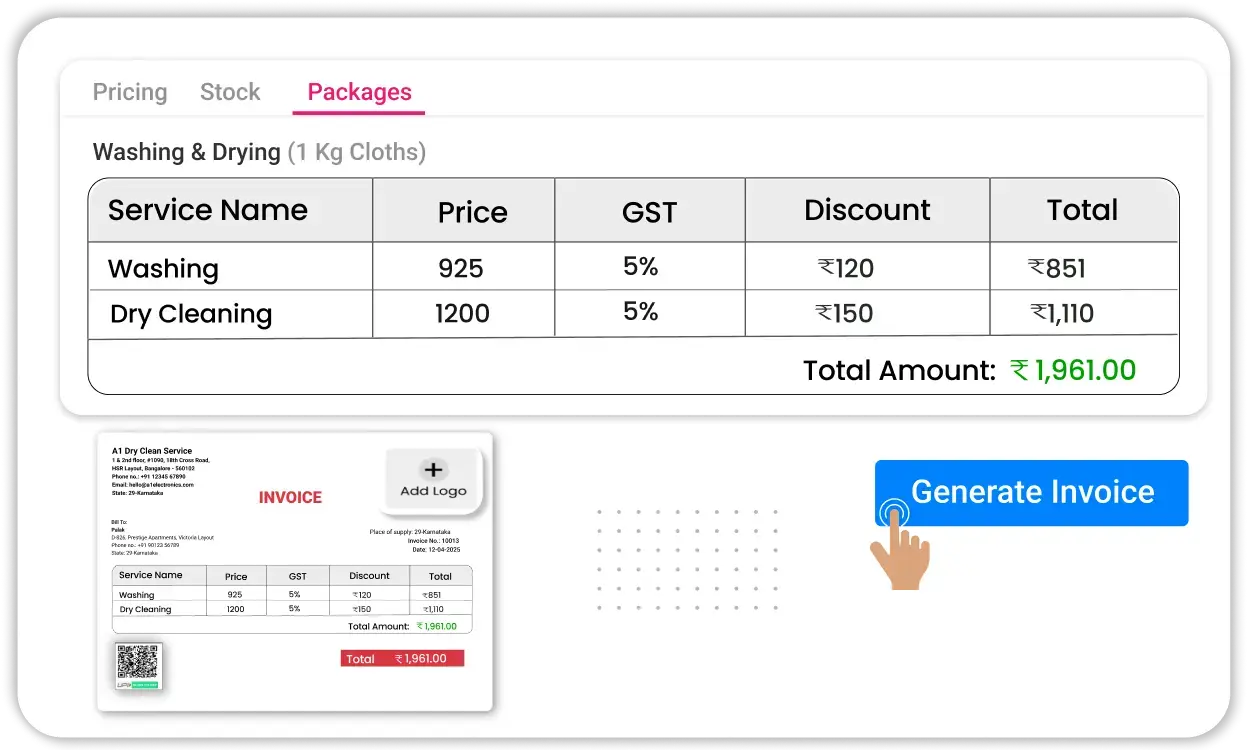 - Package Invoice Generation – Generate a single invoice for bundled services, making the billing process simpler and more efficient with Vyapar’s quick dry clean software.