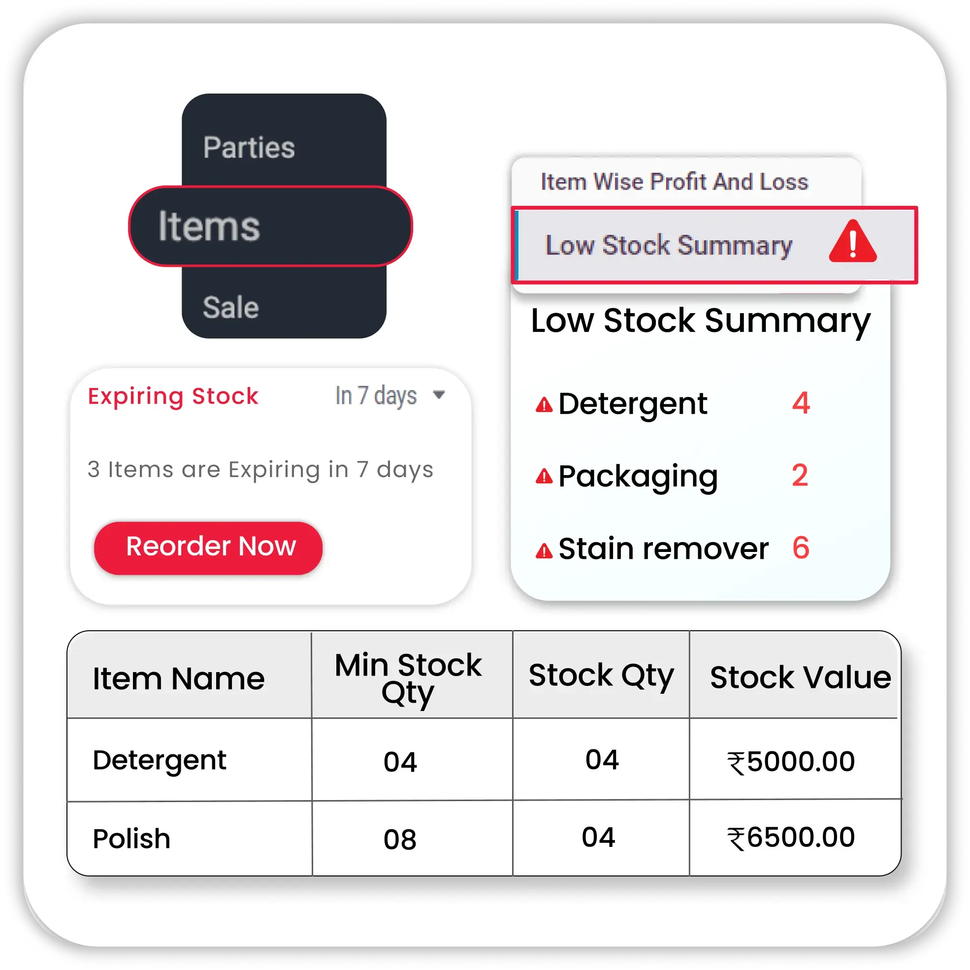 - Low Stock Alerts – Get notified when stocks are running low, ensuring you never run out of essential supplies using Vyapar’s quick dry clean software.