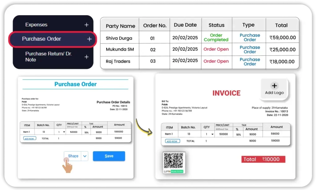 - Link PO to Purchase Entry: Convert POs into purchases, automatically updating stock — saving time for retail businesses running tight operations.
