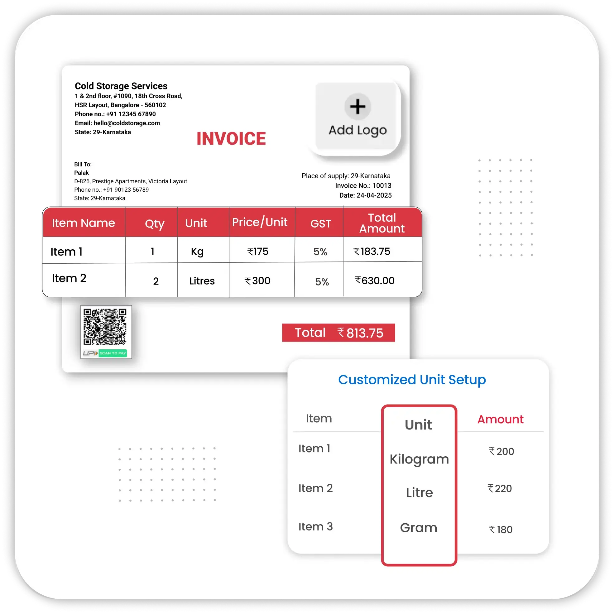 Vyapar lets you bill by crates, pallets, tons, or time stored. You can customize units based on your business model and generate accurate, GST-compliant invoices.