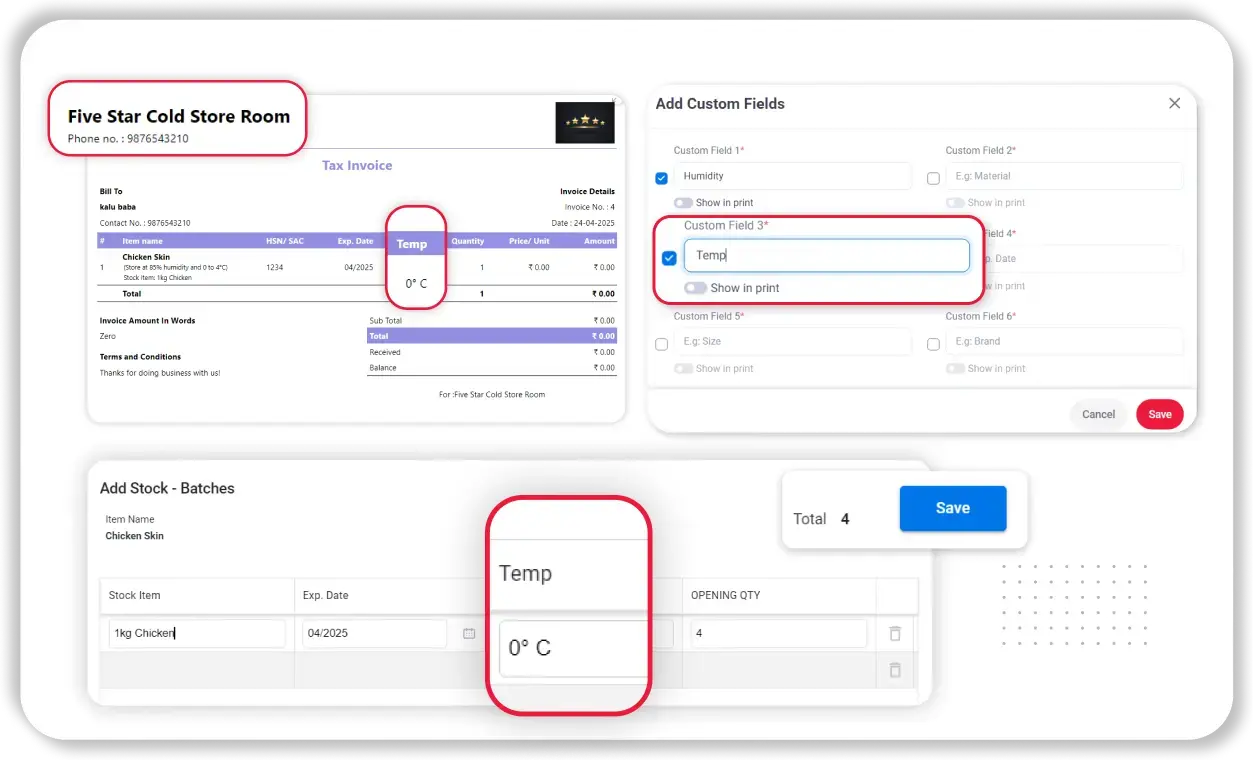 Record daily or shift-wise temperature checks for stored goods manually within notes. Helps in quality audits and compliance. - Custom Item Fields: