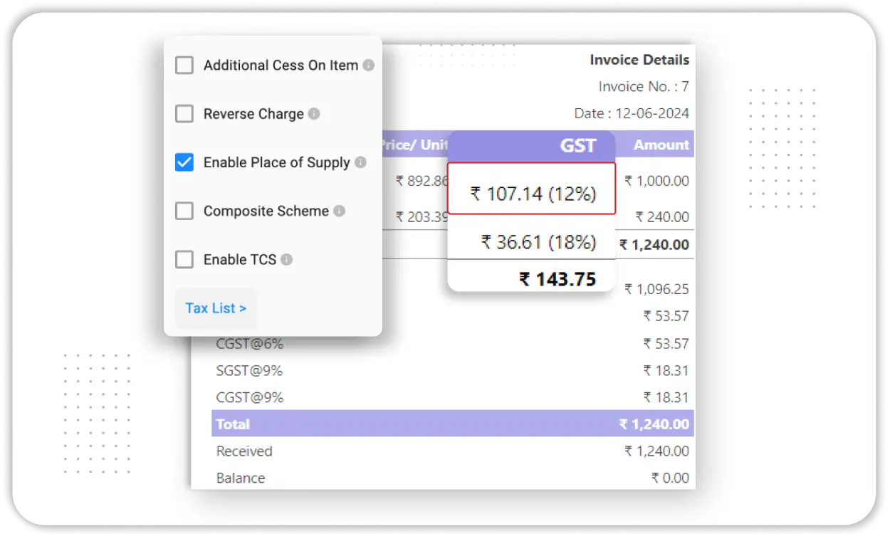 - GST Included/Excluded Options: Choose to add GST to bills when selling to business customers (B2B) or remove it for retail customers (B2C), depending on the buyer.