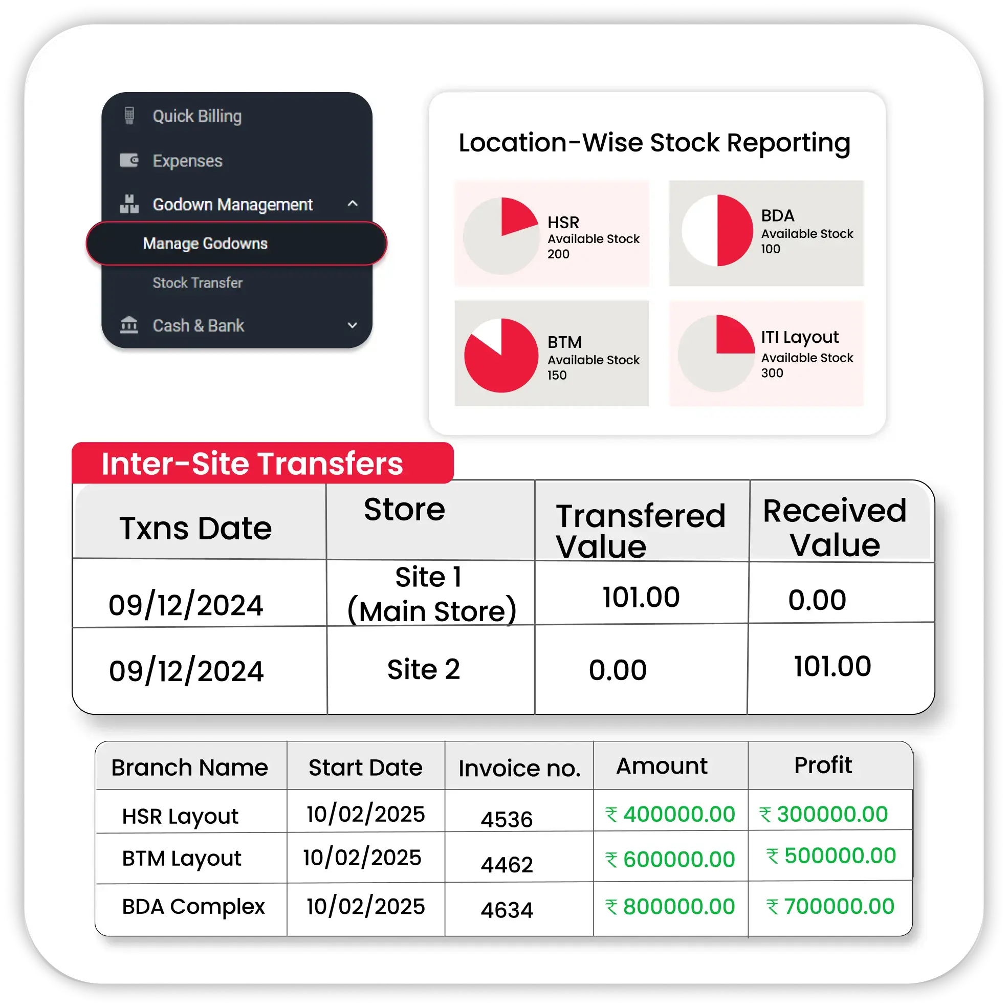 Manage stock across multiple warehouses or godowns effortlessly. Get location-wise stock reports, perform inter-store transfers, and access complete movement history for every item.