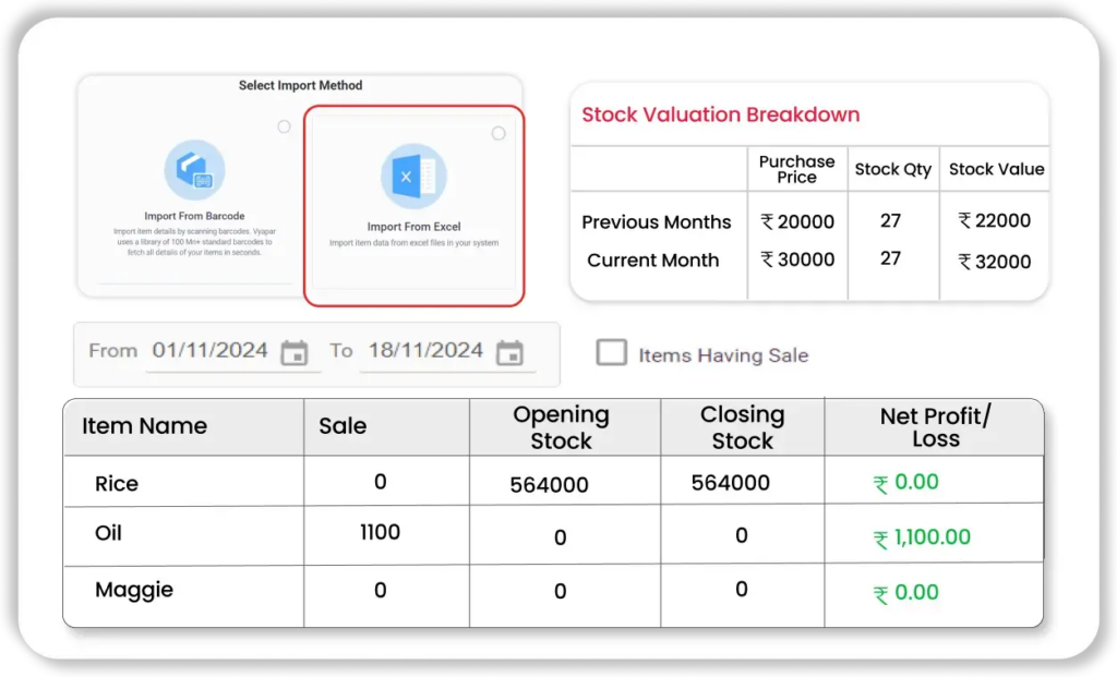 Quickly update large inventories using Vyapar’s Excel import feature in its warehouse management app.