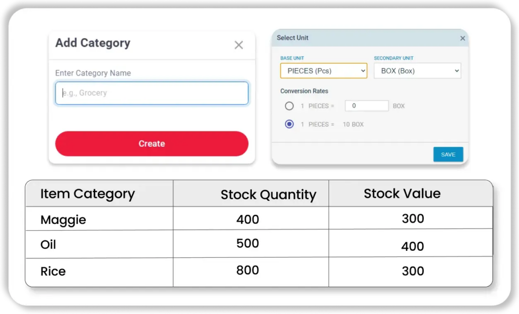 - Smart Filters & Auto Conversion – Generate reports by category or subcategory while effortlessly converting units during billing and stock entry.