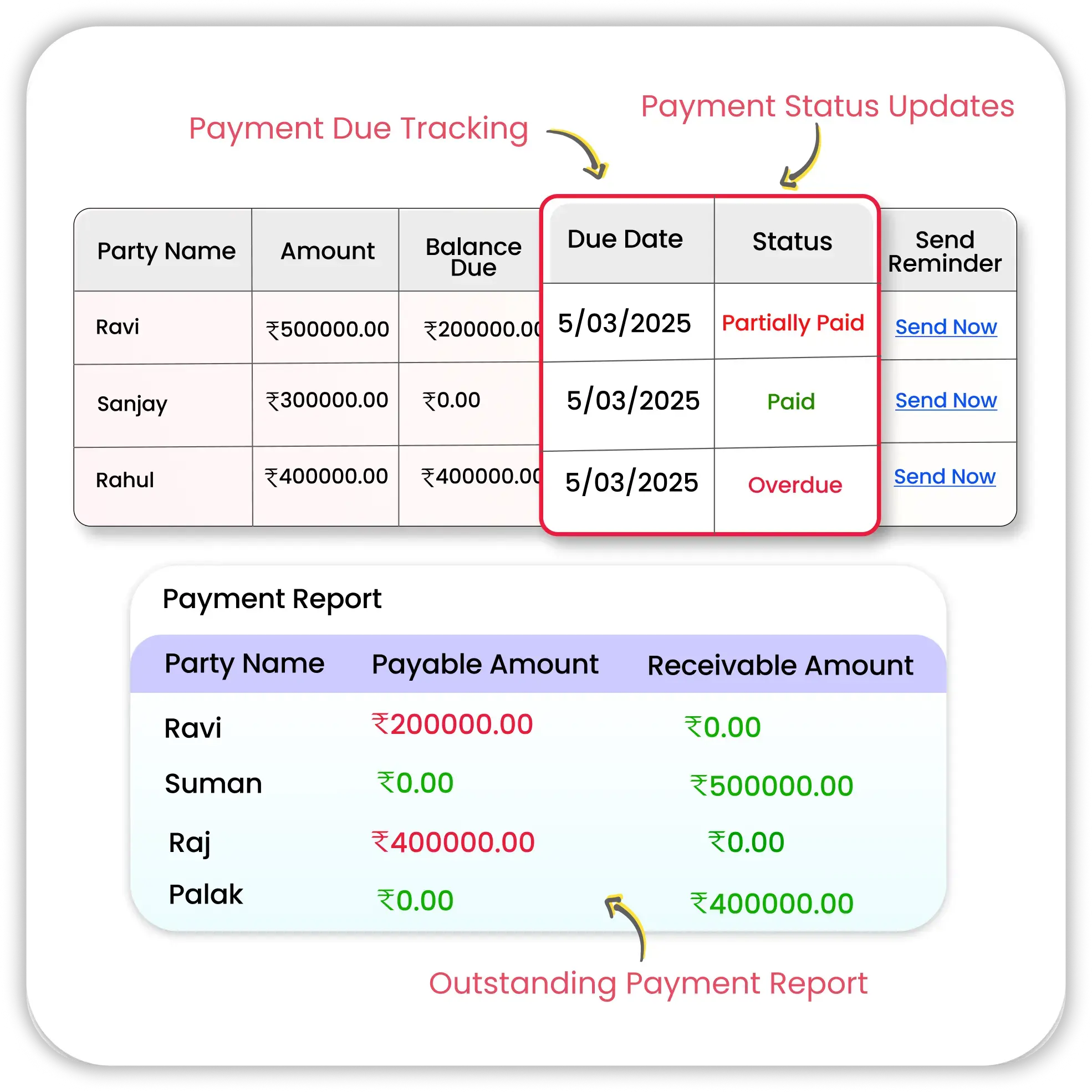 - Outstanding Dues Dashboard: View pending payments and follow up with one click. The dashboard gives full visibility into unpaid invoices.
