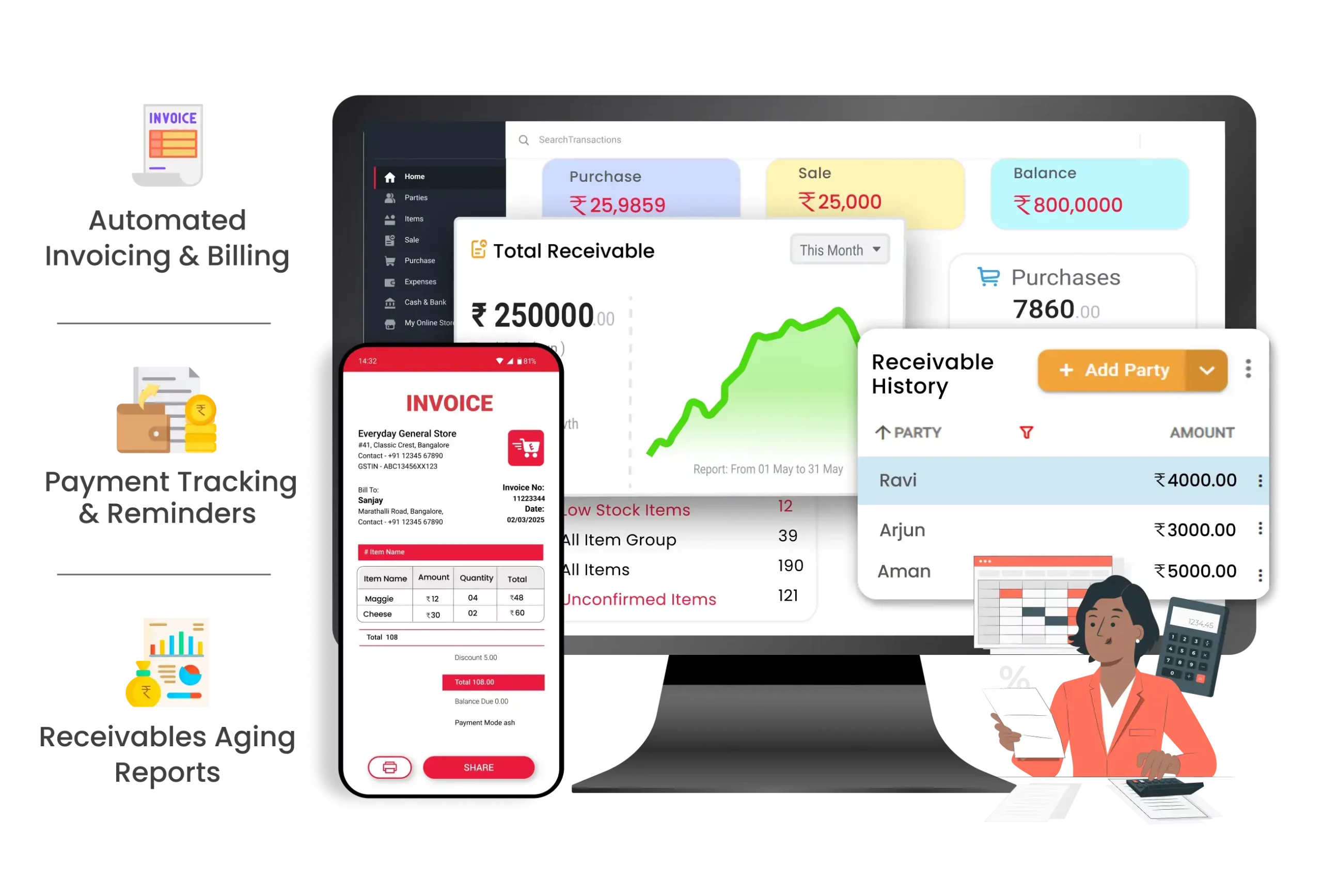 Vyapar’s best accounts receivable software helps businesses maintain a steady cash flow by automating payment tracking and reminders. With real-time insights into outstanding invoices, businesses can ensure timely collections and reduce financial bottlenecks.