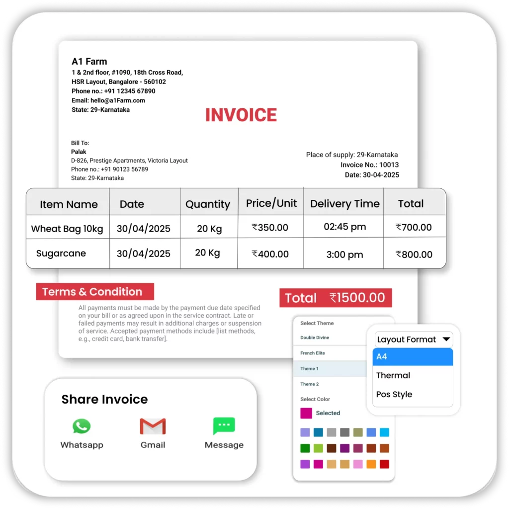 - Personalized Invoice Templates: Customize your invoice design by adding your farm’s logo, address, GSTIN, and even a personal thank-you note to customers.