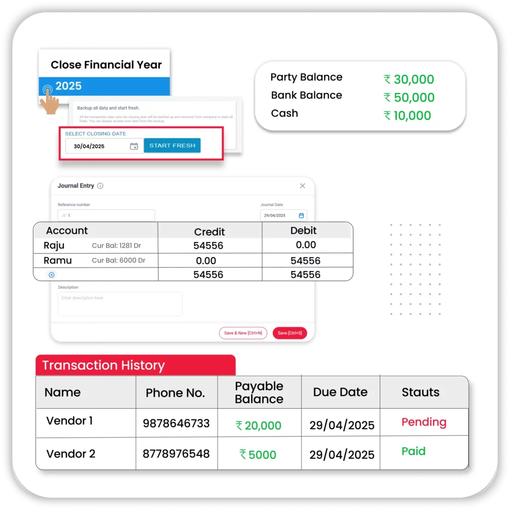 - Year-End Book Closing: At the end of the financial year, easily close your farm books with auto-generated depreciation entries, prepaid adjustments, and profit-loss calculations, ensuring smooth tax filings and audits.
