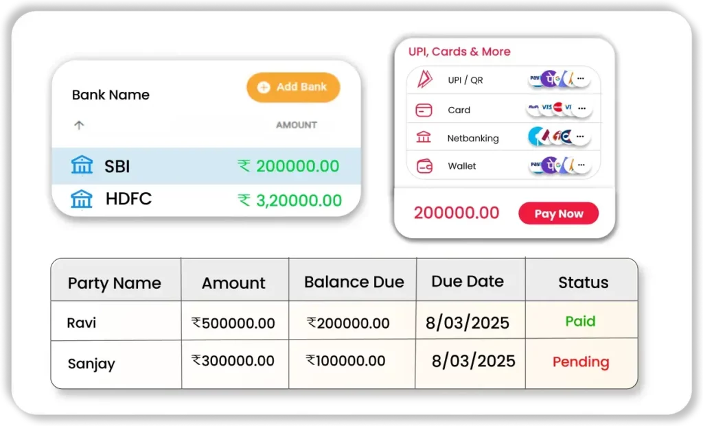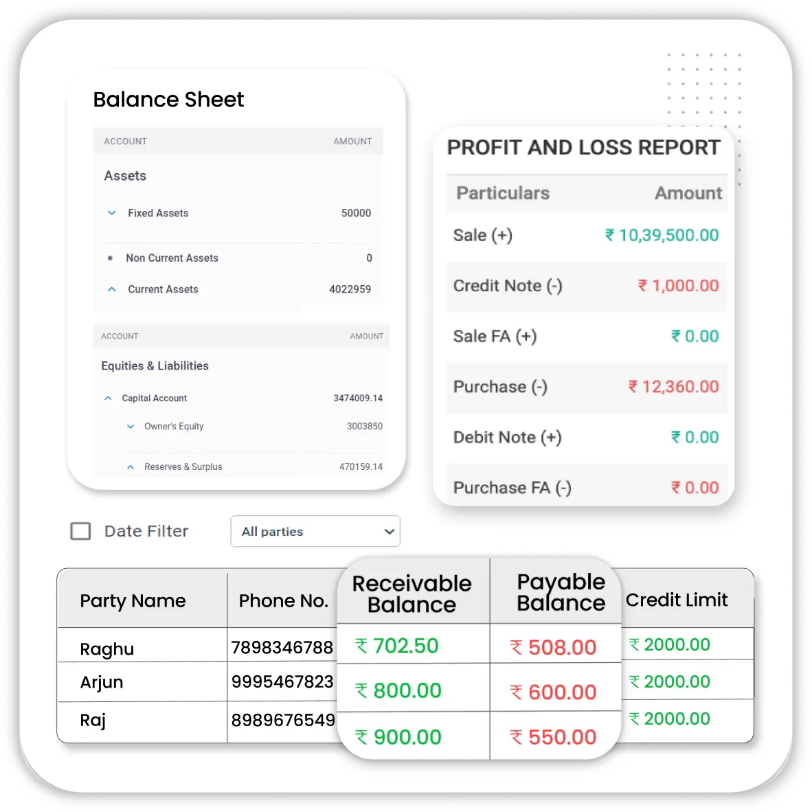 - Track Party Balances – View real-time outstanding balances for every customer and supplier. Easily monitor who owes you money and what payments you need to make, all from a single dashboard.