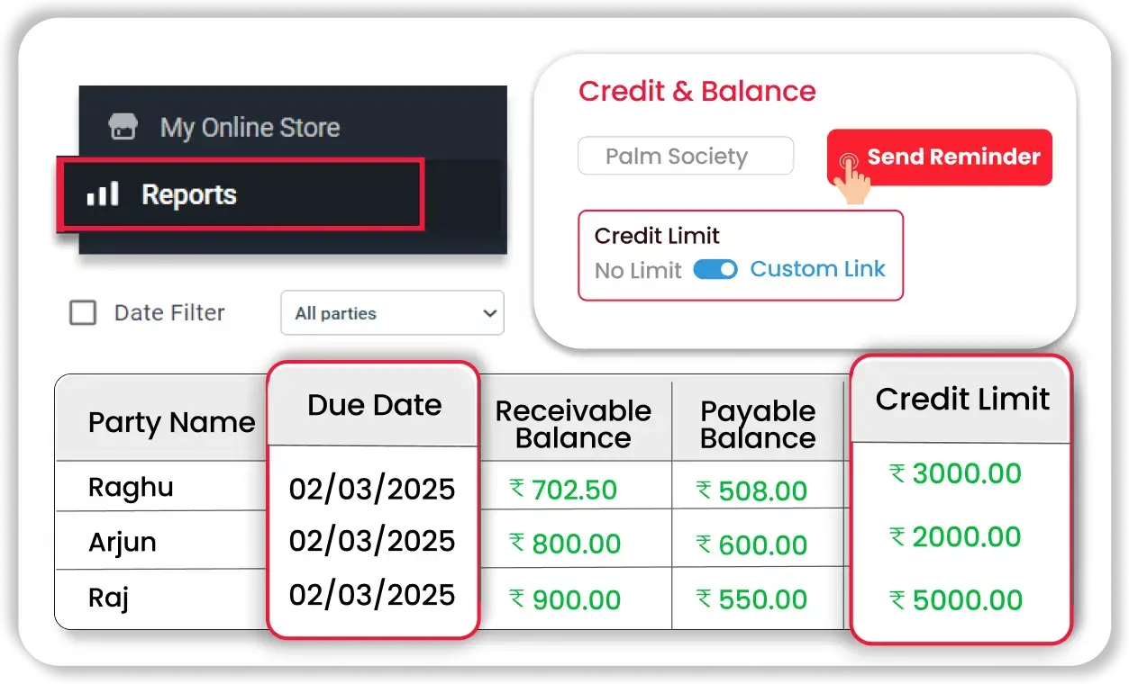 - Set Custom Credit Limits – Set a maximum credit amount for each customer to control how much they can owe you at a time. You can also define the number of days they get to make the payment after a sale.
