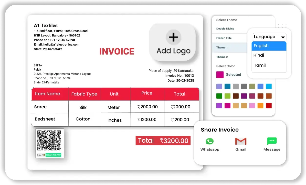 - Multilingual Support – Create invoices in English, Hindi, or your local language with ease.