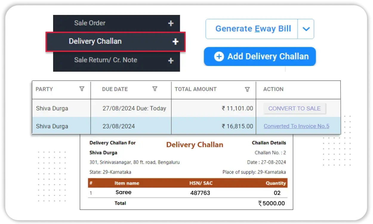 Vyapar’s textile accounting software lets you send goods using a delivery challan when the sale isn’t confirmed yet — and turn it into an invoice later when needed.