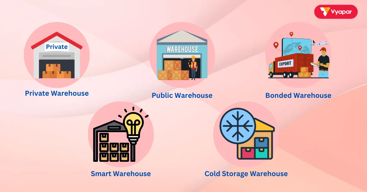- Private Warehouse. Large businesses that deal with significant volumes of goods typically use these. For example, a furniture company may have a private storeroom to store its products before delivering them to customers.