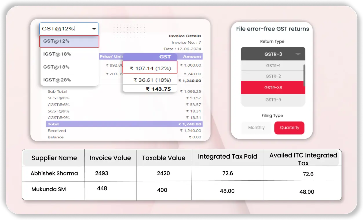 The app auto-compiles your transactions into the correct fields of GSTR-3B, including: