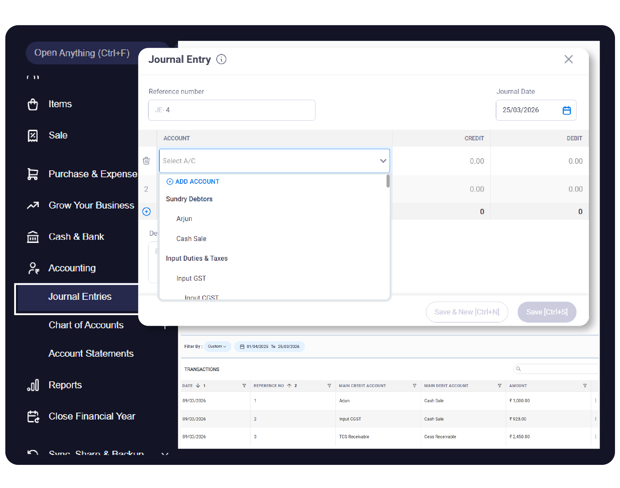 In Vyapar, the Journal Entry feature allows you to maintain double-entry accounting accuracy by manually debiting and crediting the relevant accounts.