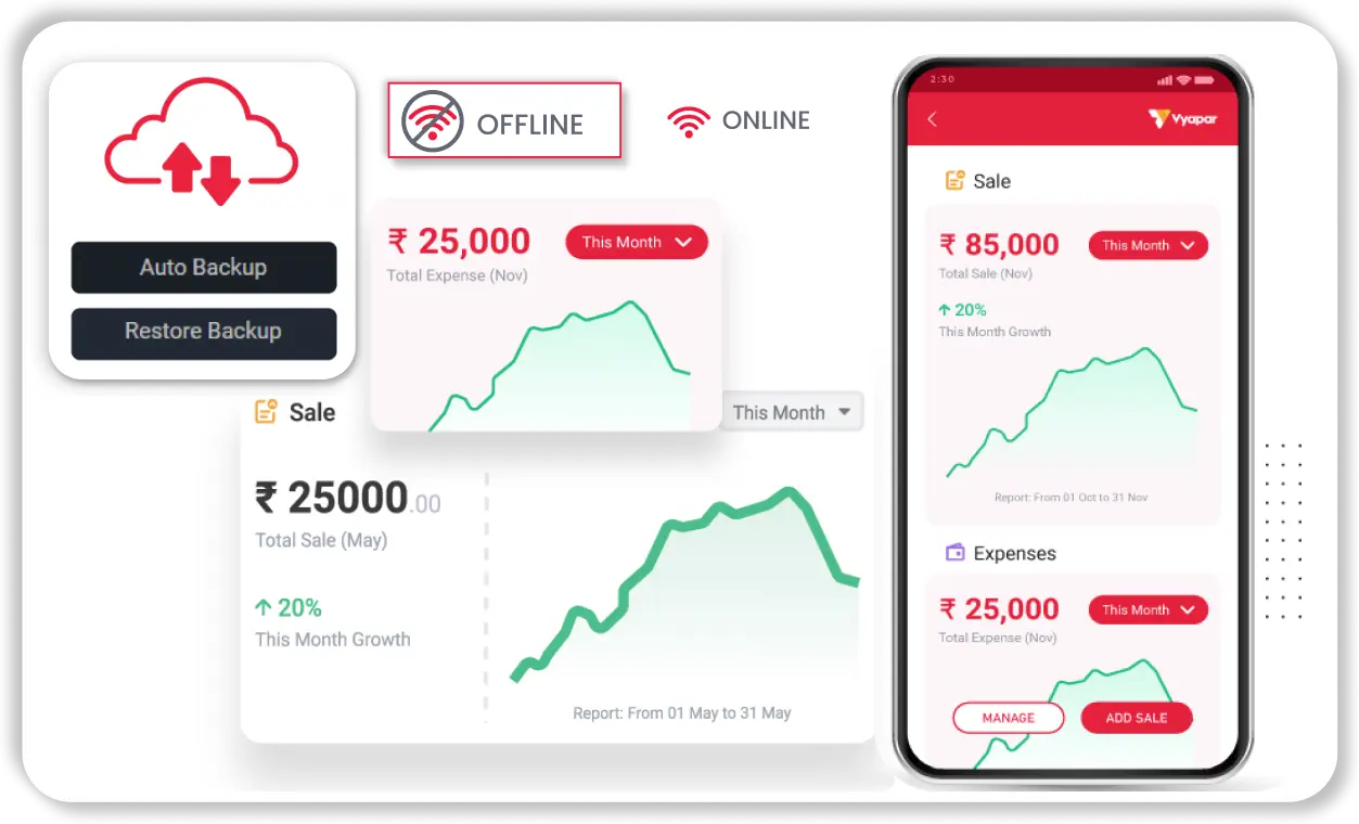 - Multi-Store Management: Manage multiple outlets from one platform. Monitor inventory, transactions, and staff activity easily. Plus, Vyapar’s secure cloud backup protects all your important data.