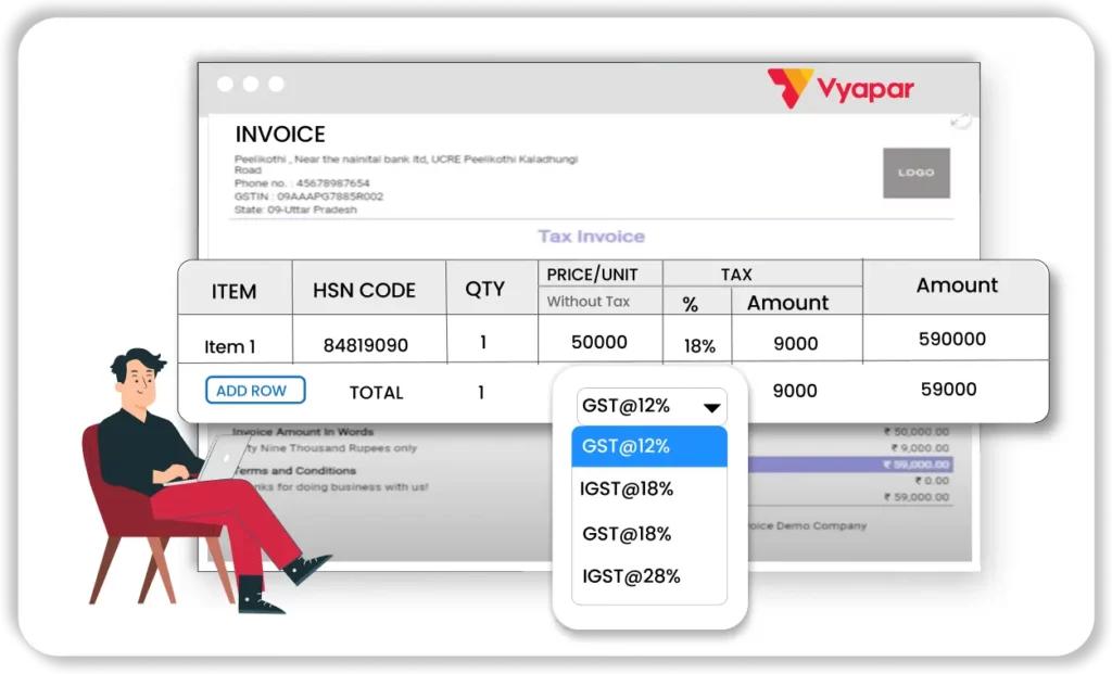 Vyapar calculates GST automatically based on predefined tax rules. You simply input item details, and the software adjusts the total bill value according to the GST slab. It saves time and ensures error-free invoicing.