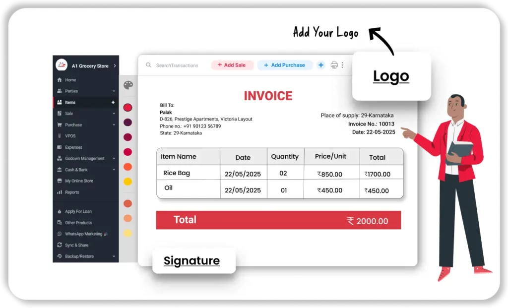 - GST & Offers: Apply applicable taxes and offer discounts during sales or festivals directly from the billing screen.