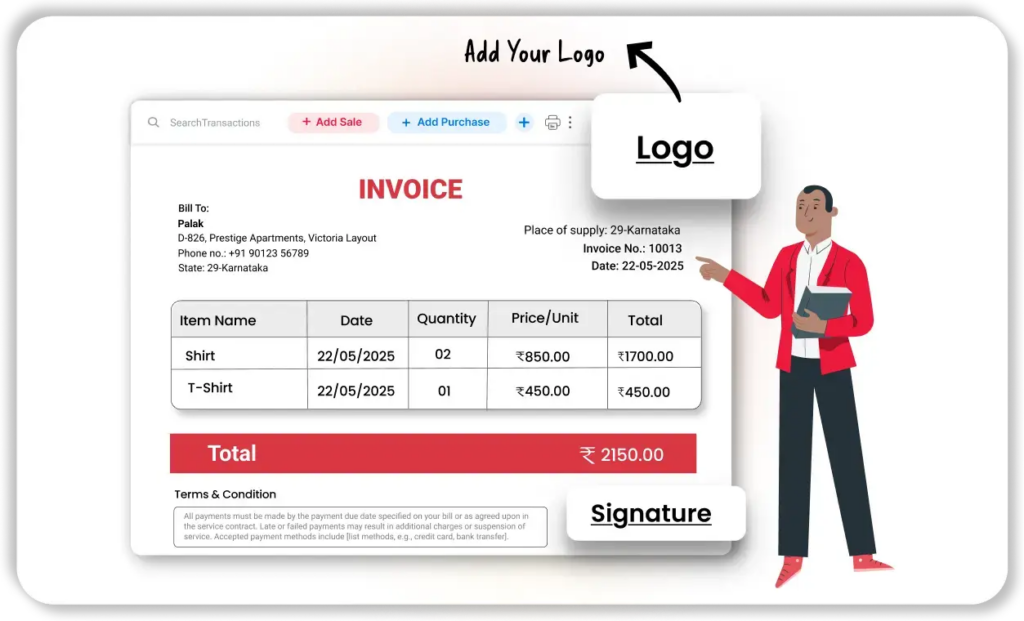 Add the customer’s full name, contact number, and address (if needed). If it’s a B2B sale or a GST invoice, include their GSTIN. These details help maintain accurate records and simplify communication in case of future follow-ups.