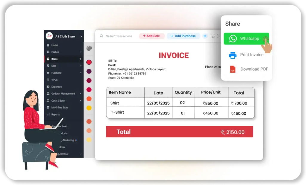 With Vyapar, you can send bills via WhatsApp, email, or SMS directly from the app. Your customers can instantly receive the cloth bill or cloth store bill format download in digital format for convenience.