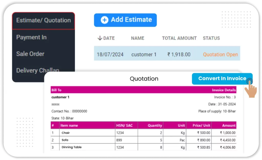 - Quotation-to-Invoice Conversion: Save time by instantly converting a quotation into an invoice, eliminating manual data entry.