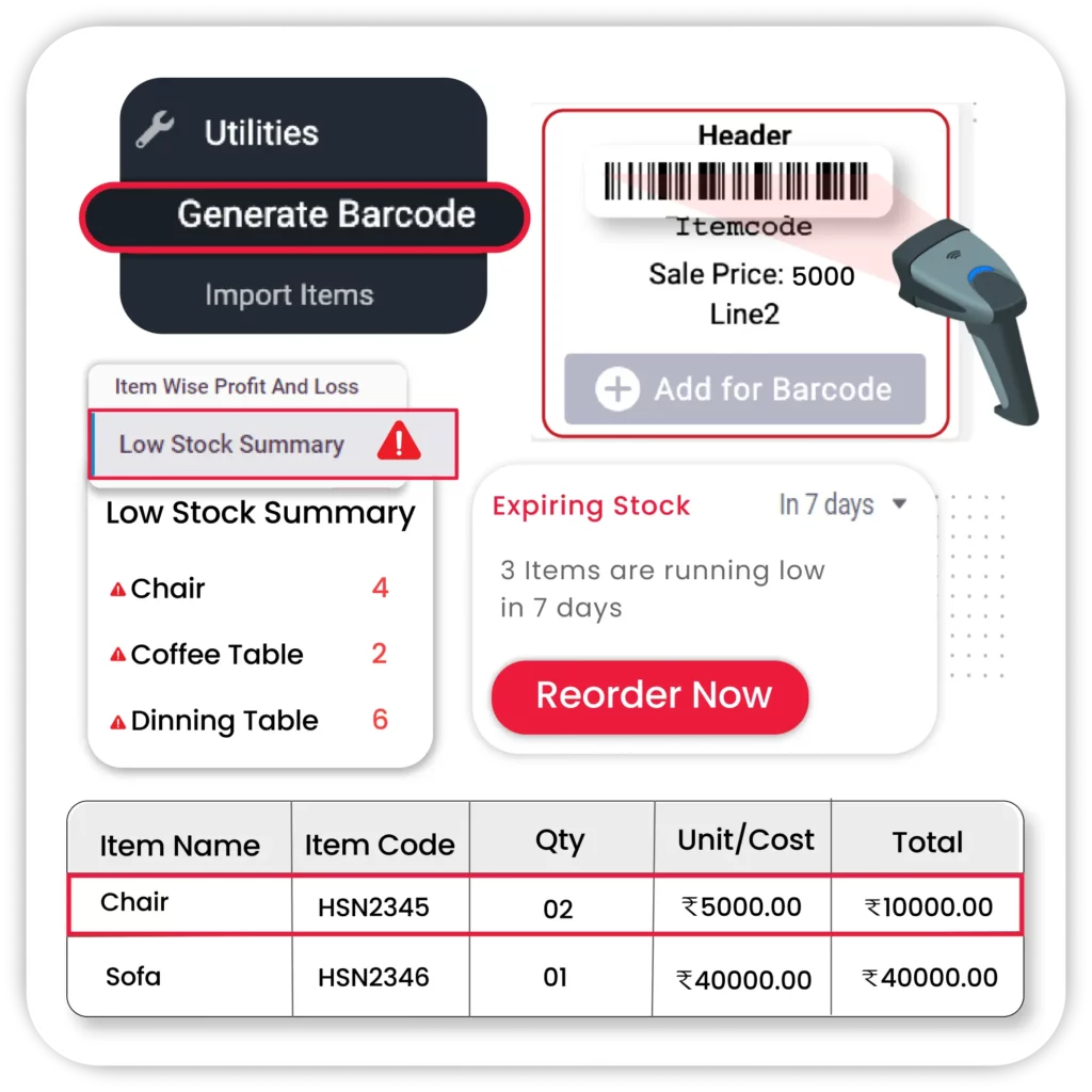 Efficiently manage furniture stock with barcode and SKU tracking features in Vyapar’s furniture store POS software.