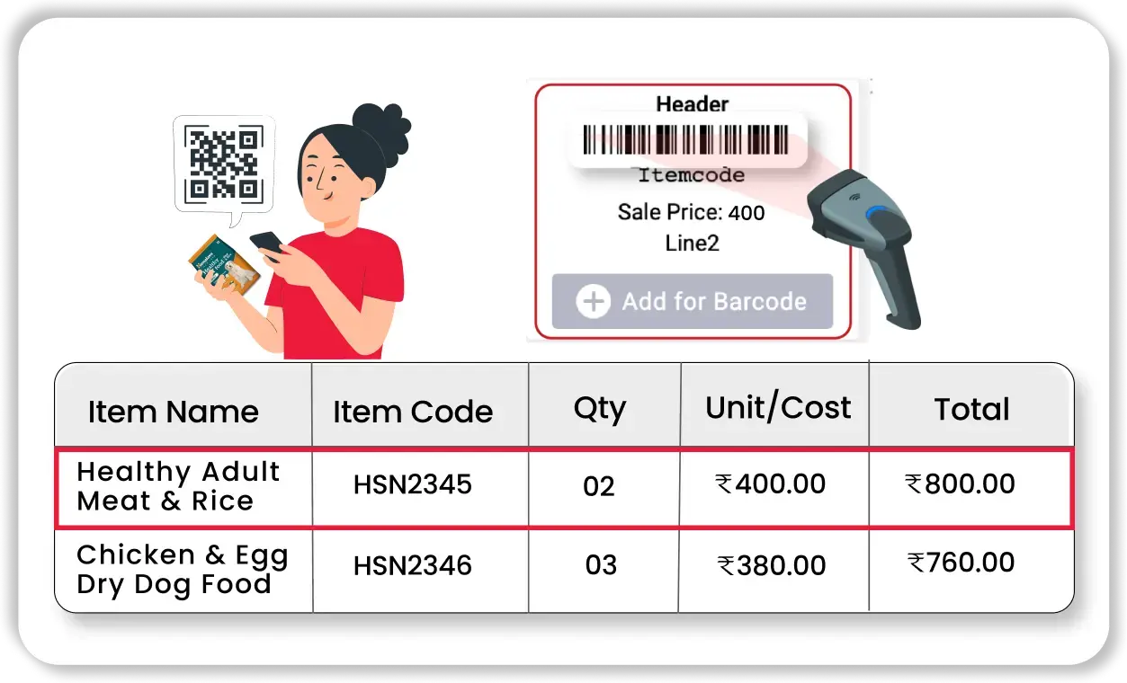 - Scan to Bill – Vyapar supports barcode scanning, allowing you to instantly add products like pet toys, food, or leashes to the bill without manual entry.