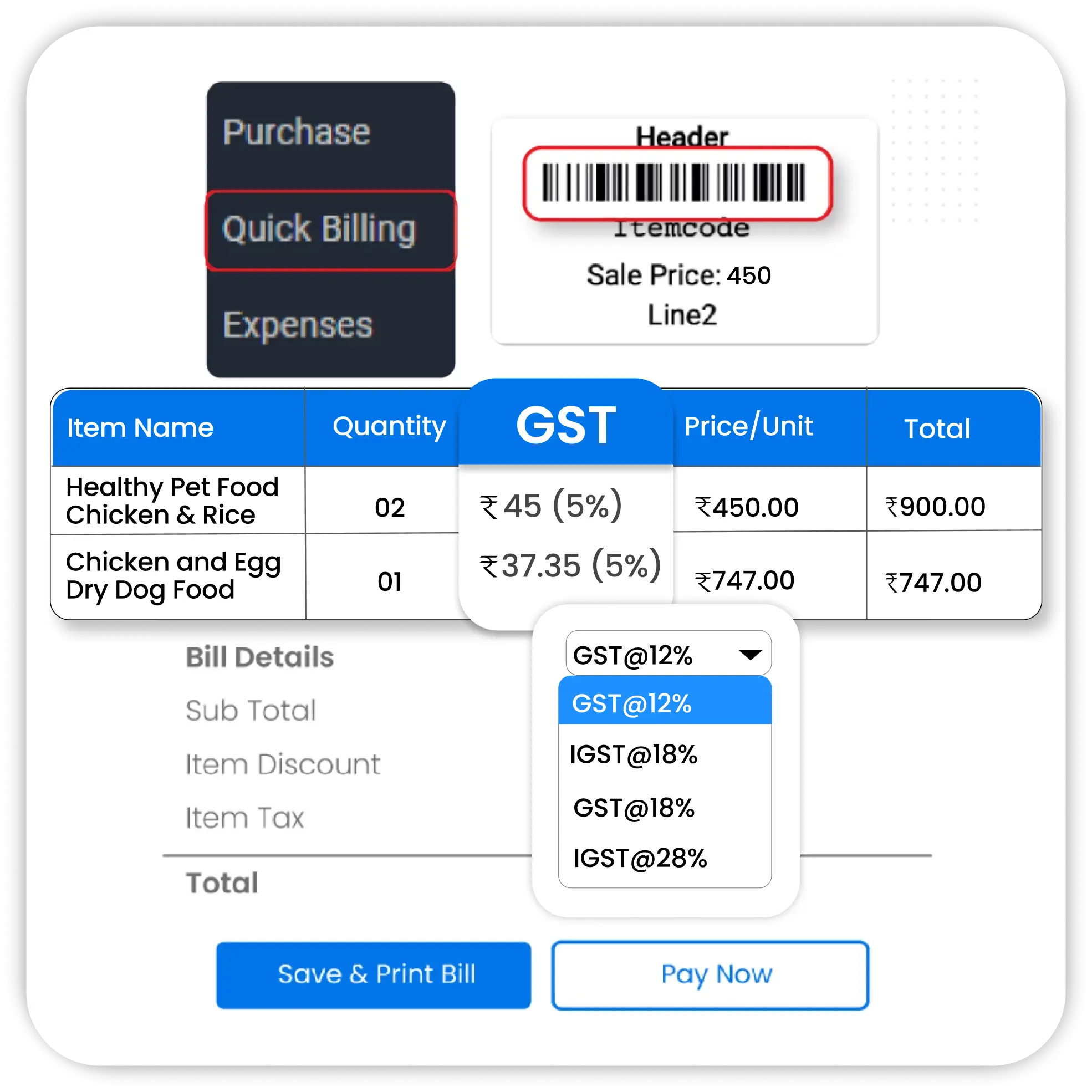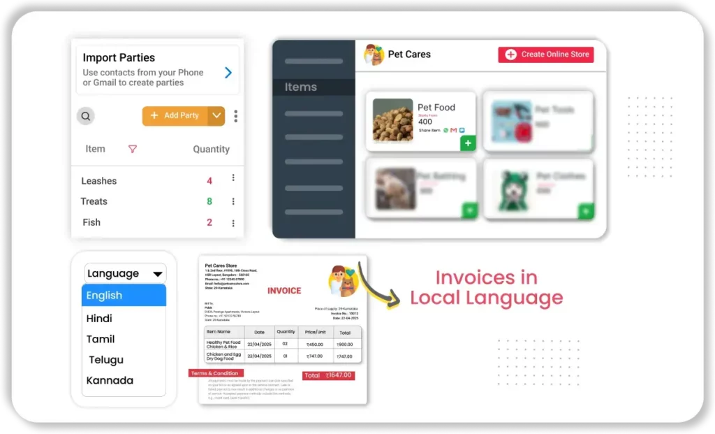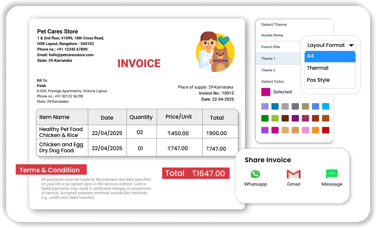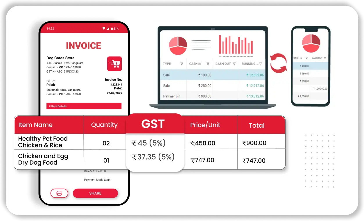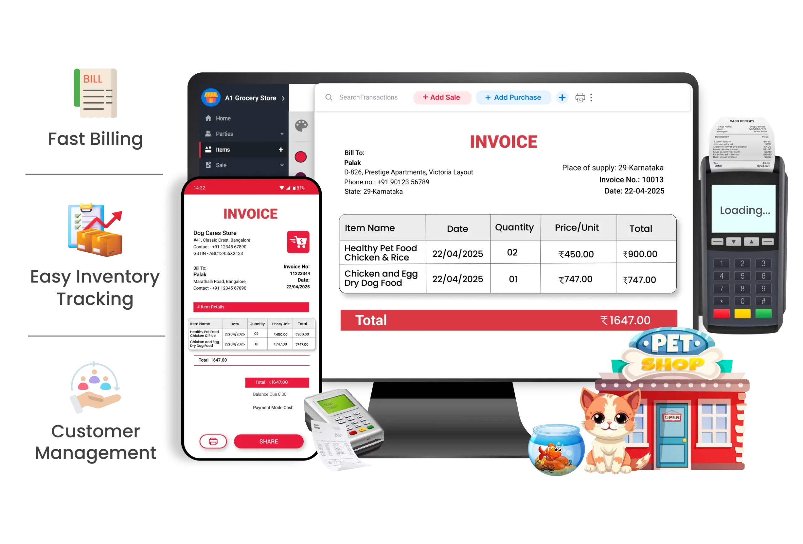 - Quick Invoice Generation – Create GST-compliant bills within seconds for pet food, toys, accessories, and more.
