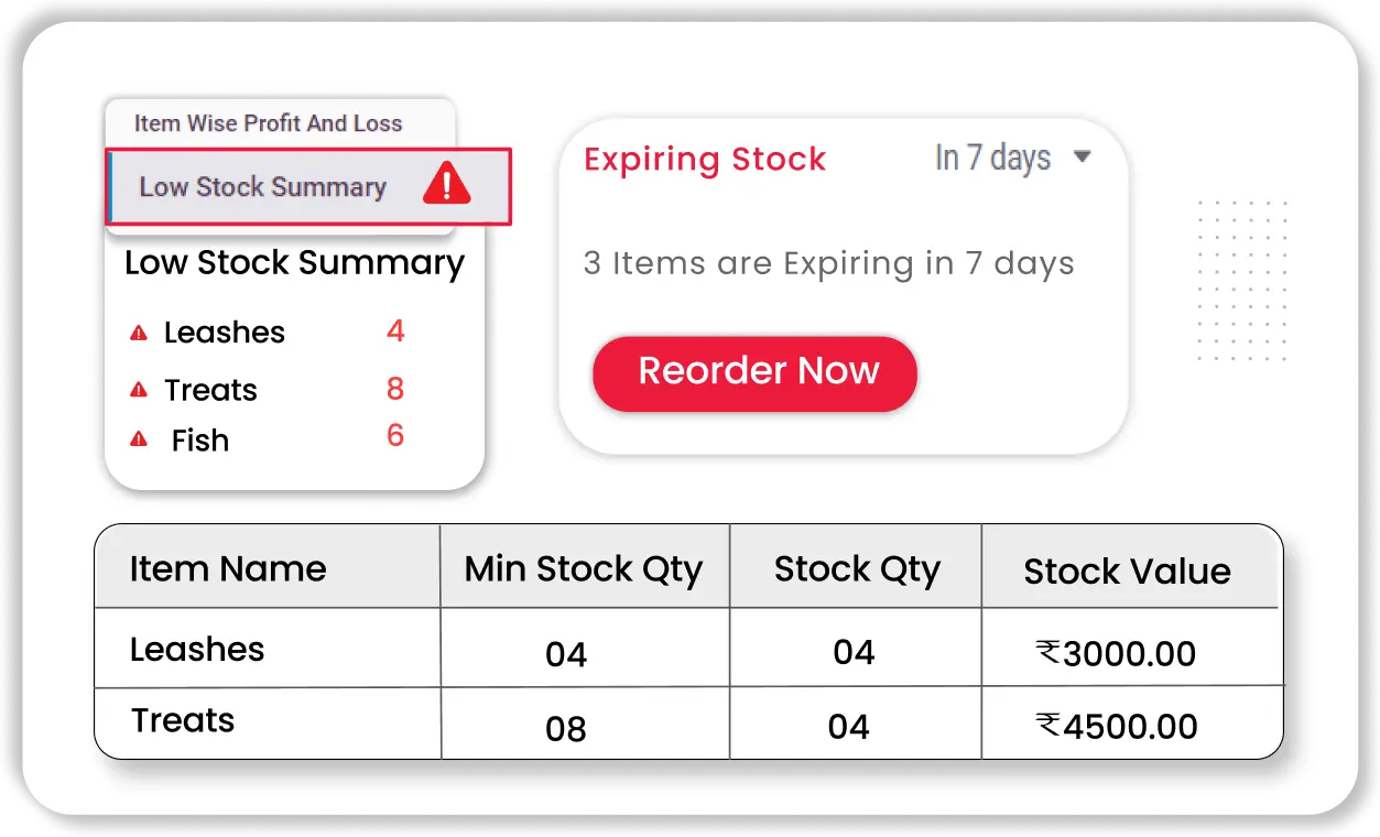 - Instant Stock Alerts – Vyapar allows you to set minimum stock limits for items like dog food or grooming tools. When stock goes below the limit, the app notifies you.