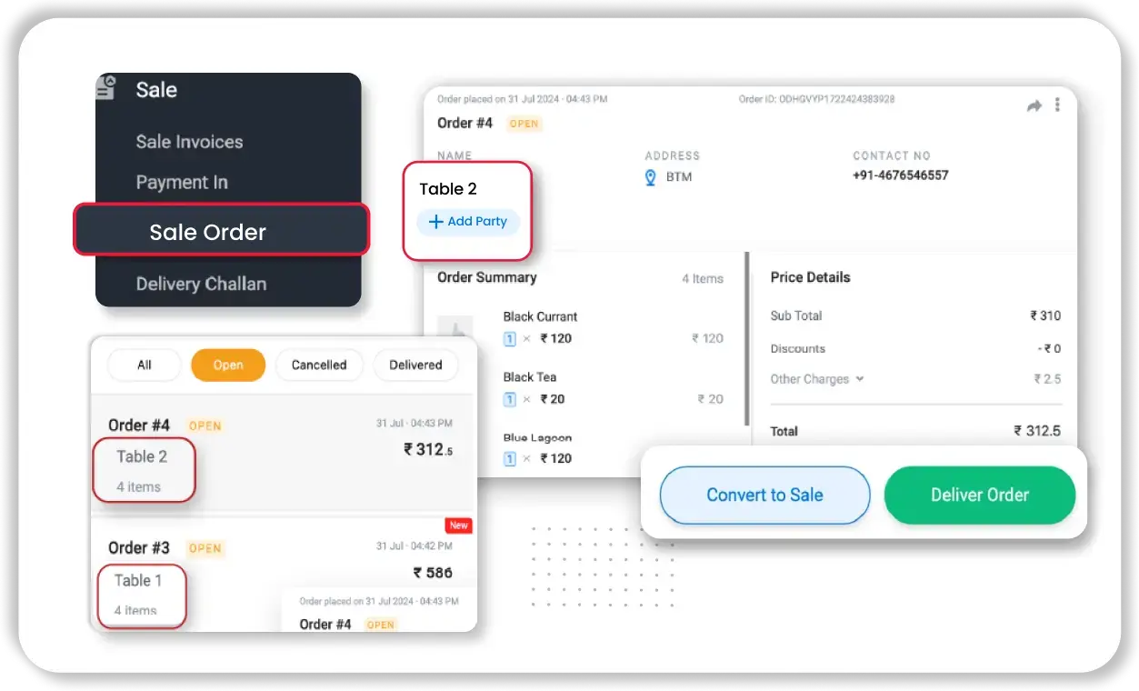 - Quick Order Processing – Generate invoices instantly with GST and discount options for dine-in, takeaway, and delivery orders.