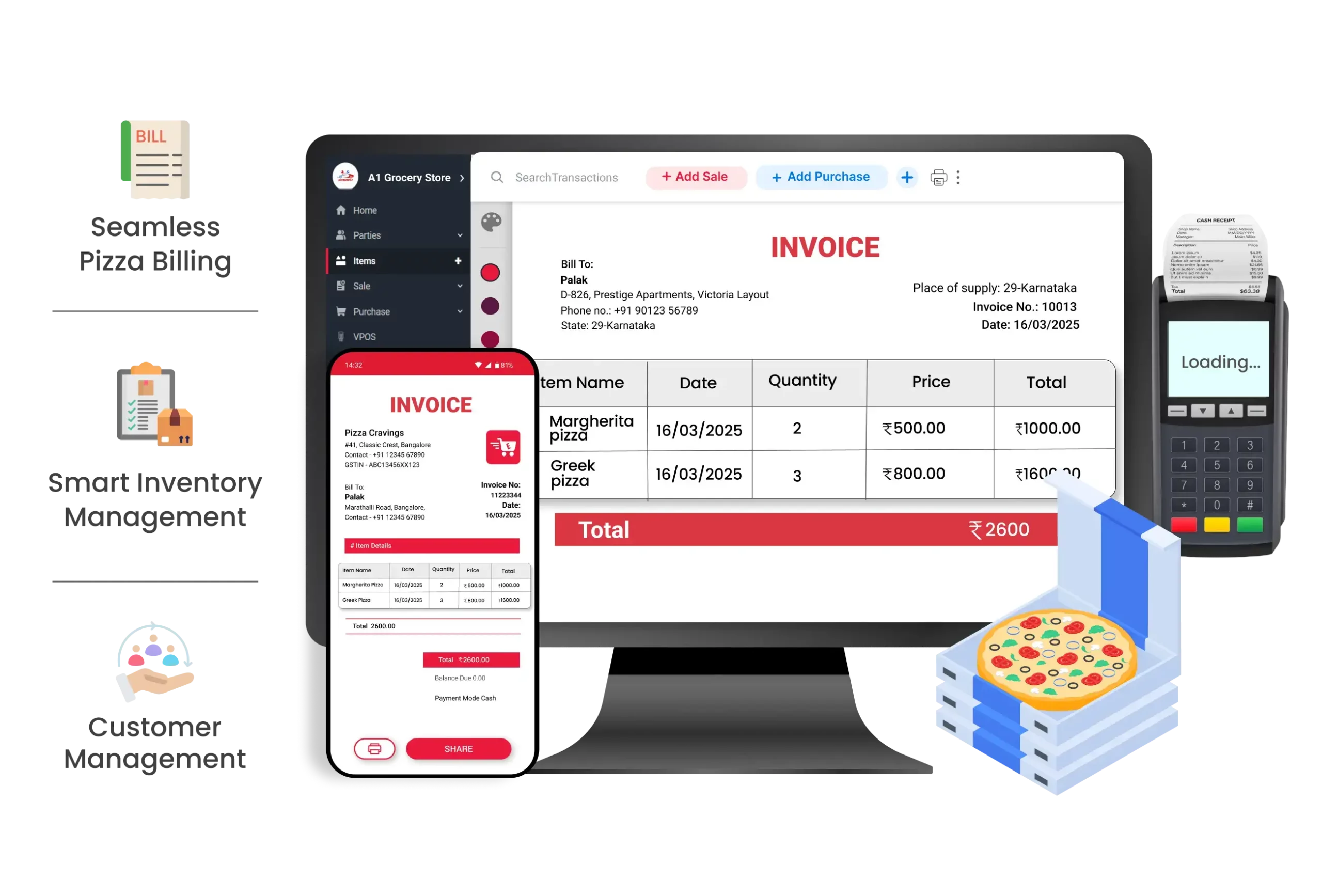 A professional invoicing system in a POS software for a pizza shop ensures clean, branded receipts with GST details. Digital invoices and automated billing add to the restaurant’s credibility.