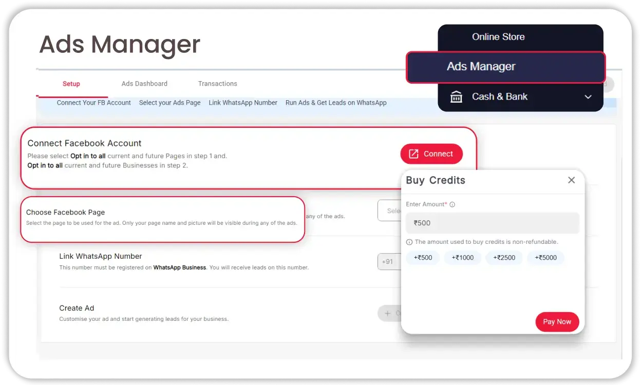 - Facebook Ad Integration – Create and launch Facebook ads from Vyapar to attract more customers and drive sales.