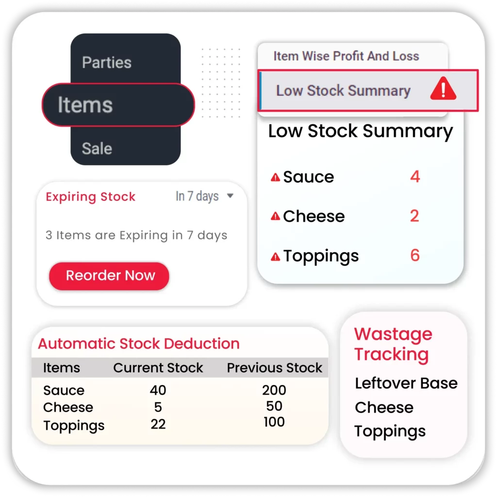 A pizza restaurant POS system like Vyapar keeps track of ingredient stock in real time. It offers low-stock alerts, recipe-based inventory deduction, and wastage tracking, ensuring you never run out of essential supplies like cheese, sauce, or toppings.